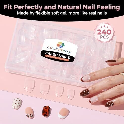 Luckyfairy Short Oval Round Nail Tips set includes 240 short oval clear nail tips in 12 sizes (0–11). Made from soft gel with a full cover, half-matte finish designed for natural-looking nails and improved grip. Tips are pre-shaped for easy application and are breathable, lightweight, and toxin-free with an odorless formula. The product is designed to offer durable wear with break resistance and can last up to 28 days. Suitable for gel polish, acrylics, dip powder, poly nail extensions, or press-on nail art for home DIY or salon use.