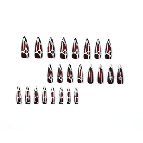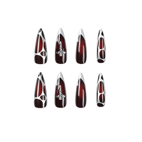 Elevate your look with MISUD press-on long nails in an almond shape featuring a gothic red-to-black ombre. Includes 24 glossy tips in 12 sizes and glue for quick, precise fitting; 3D cross rhinestones and chrome swirl accents.
