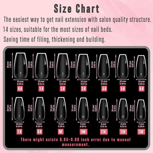 14 distinct sizes, including a size 0 available in two columns in the packaging, to fit a wide range of nail beds from broad to petite.
