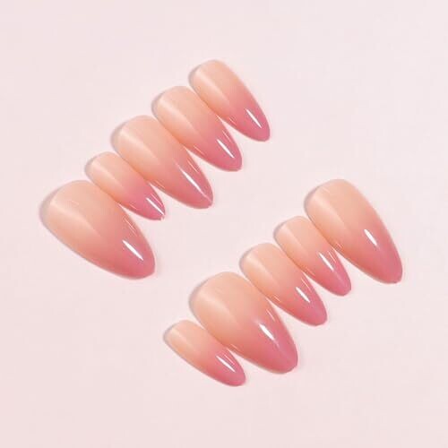 Long-lasting press-on nails with a comfortable fit for daily wear. 24-piece set with varied sizes to match different finger sizes. Easy at-home DIY with mini nail file and 24 adhesive tape stickers. Pink gradient almond-shaped full-coverage nails for an elegant look.