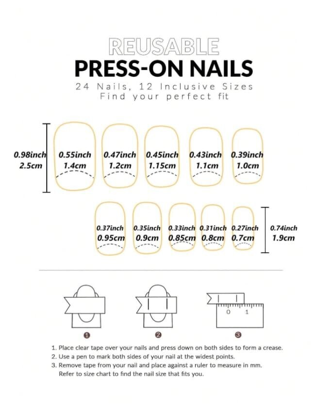 Pre-sized press-on nails with included adhesive for quick and simple DIY manicure at home.