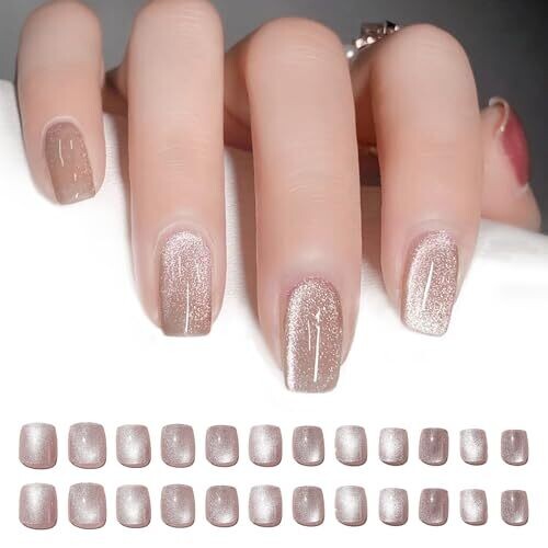 Qioon delivers a salon-worthy manicure at home with 24 short square cat eye press on nails in a French nude glitter finish. Includes 24 nails, 12 sizes, and adhesive tabs for easy, mess-free application and long-lasting wear.