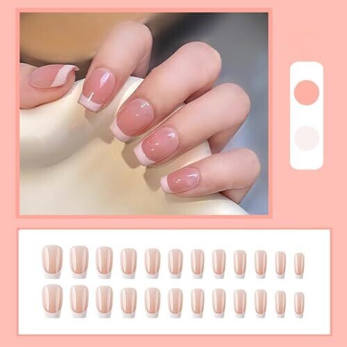 • Qisankee Short French Tip Nails - Coffin Press On Fake Nails, Pink French Tip - 24 pcs/Set