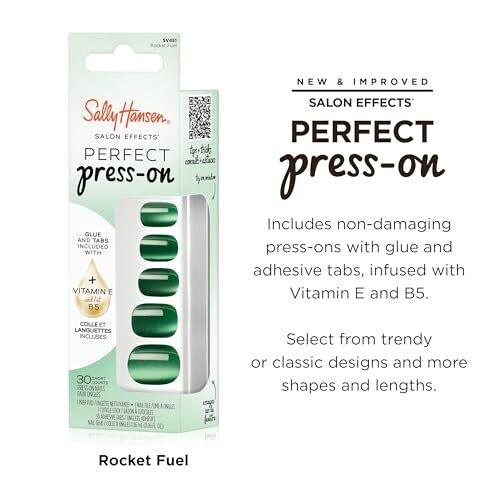 Sally Hansen Salon Effects Perfect Press-On Nails, Rocket Fuel. Product includes press-on nails, glue with vitamins E and B5, and adhesive tabs. Designed for rapid application to achieve a salon-quality manicure at home. The set offers 30 unique nail art designs. The glue provides secure adhesion and is formulated to be non-damaging to natural nails. Tabs are designed to provide a comfortable, reliable fit and reduce potential harm to natural nails. Removal is designed to be quick and easy with minimal mess.