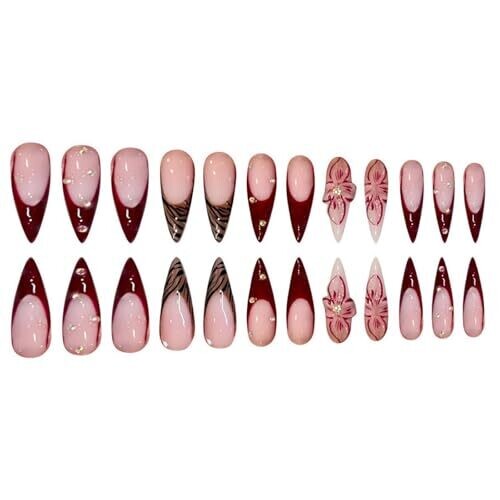 • Seeneey 24pcs Press On Nails Stiletto French Brown Pink Flowers Leopard Print
