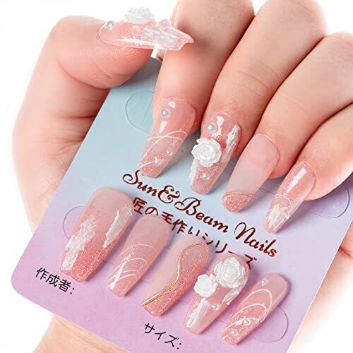 • Sun&Beam Nails Handmade Press On Nail Long Coffin Ballerina Pink Flower Acrylic 3D Design (#002 L)