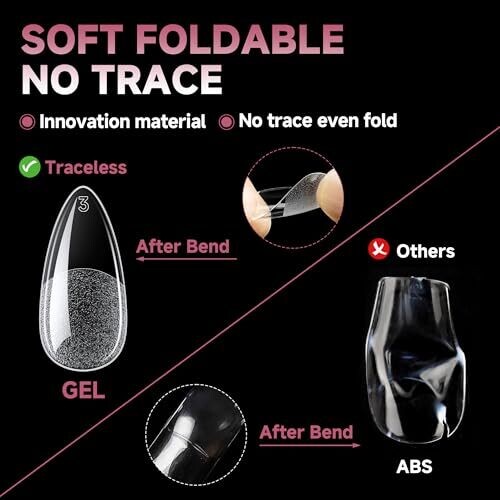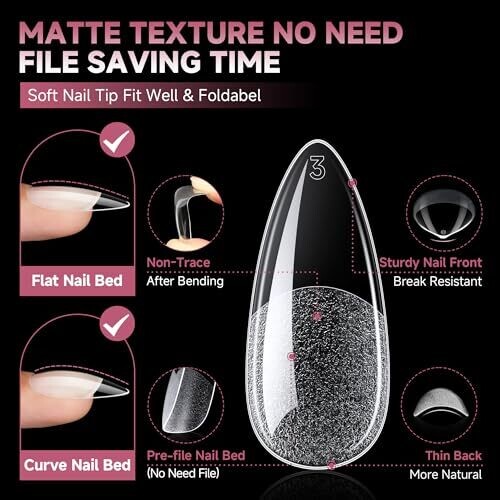 Half matte gel nail tips with almond shape for efficient filing and a professional look. Clear surface with glossy finish for easy coloring and long wear. Soft gel material is flexible and returns to shape, with 12 sizes and 312 pieces.