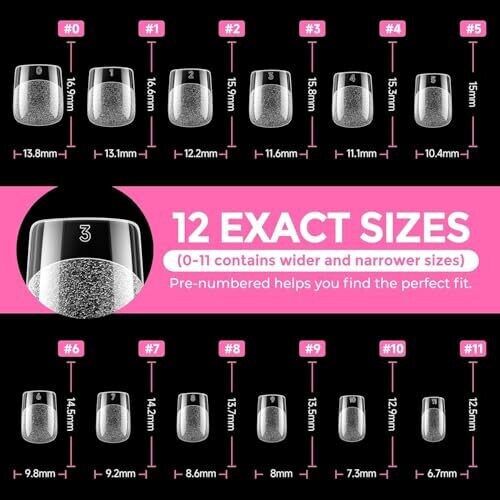 Professional Extra Short Square Shape Tips; great extension with a clear cover. Soft gel tips compatible with nail polish, dip powder, and acrylics. Easy to use with a shallow curve for snug application and natural appearance. Pre-shaped tips save time as no filing is required. No trace when pressed flat and easy to trim, paint, and shape. Long-lasting up to 21 days with proper application and no odor or nail harm. Includes 12 sizes with size numbers on the tips for easy selection; two extra sizes are included for larger or smaller nails.