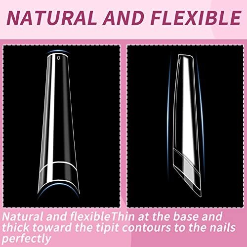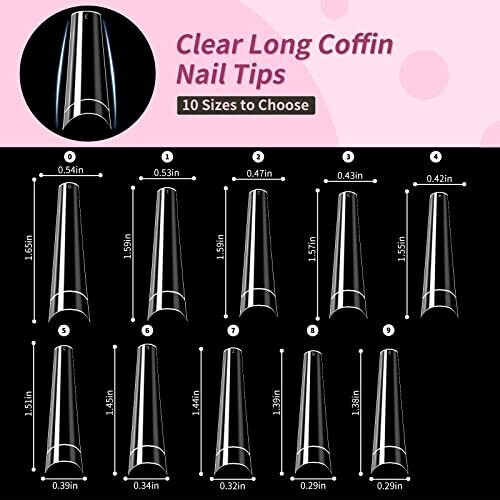 Experience premium crystal-clear coffin tips with 3XL no C curve for a sleek, salon-quality acrylic nail set. Half-cover, extra clear, easy to apply at home or in salons. Includes 500 pieces across 10 sizes for perfect fit and versatility.