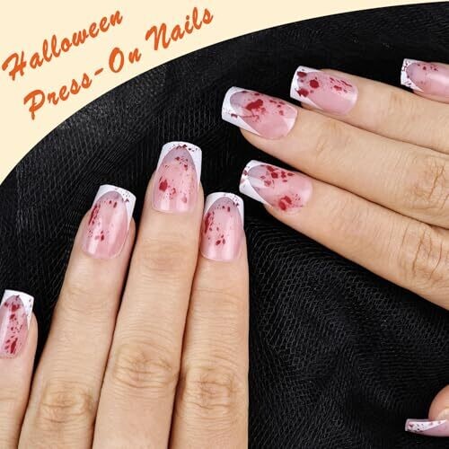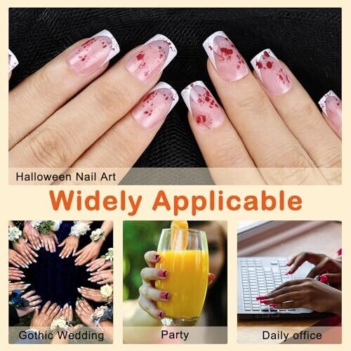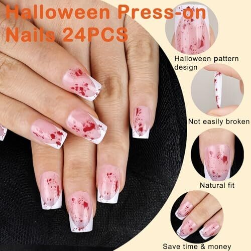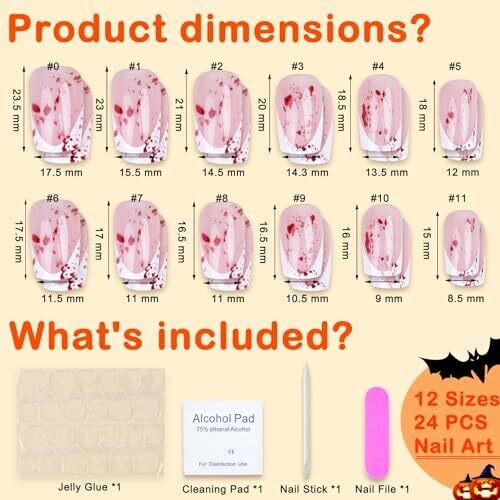 24 Halloween press-on nails in 12 different sizes, 1 mini nail file, 1 sheet jelly glue, 1 wooden remover stick, and 1 cotton pad. Materials