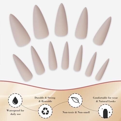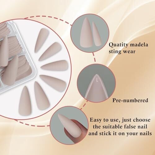 Achieve a chic, matte khaki manicure with long stiletto press-on nails. Includes a full set in multiple sizes for a precise fit, made from durable ABS. Easy, salon-free application with glue or tabs, finished with a luxurious velvet matte.