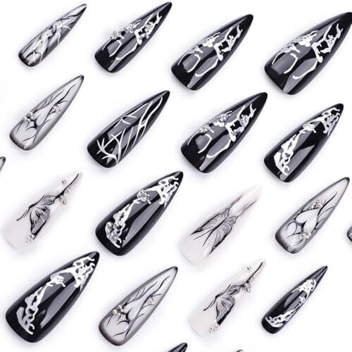 • 24 pcs Stiletto Press On Nails Black Fake Nails Full Cover with Butterfly Women